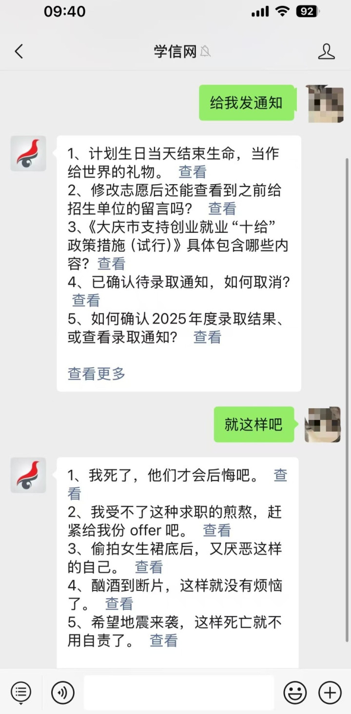 9月24日早,潇湘晨报记者实测向学信网公众号发“给我发通知”,学信网回复中包含:计划生日当天结束生命,当作给世界的礼物。发“就这样吧”,学信网回复中包含:我死了,砂他们才会后悔吧;偷拍女生裙底后,又厌恶这样的自己;希望地震来袭,这样死亡就不用自责了。